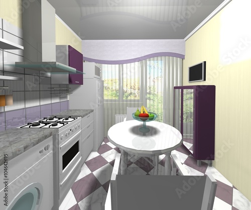 Interior Design Modern Kitchen 3d Rendering White Purple Color