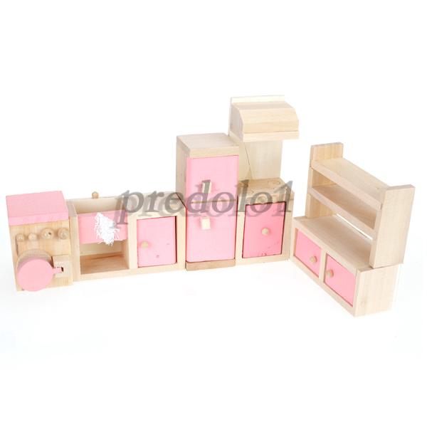 Dollhouse Miniature Furniture Wooden Kitchen Set White Pink