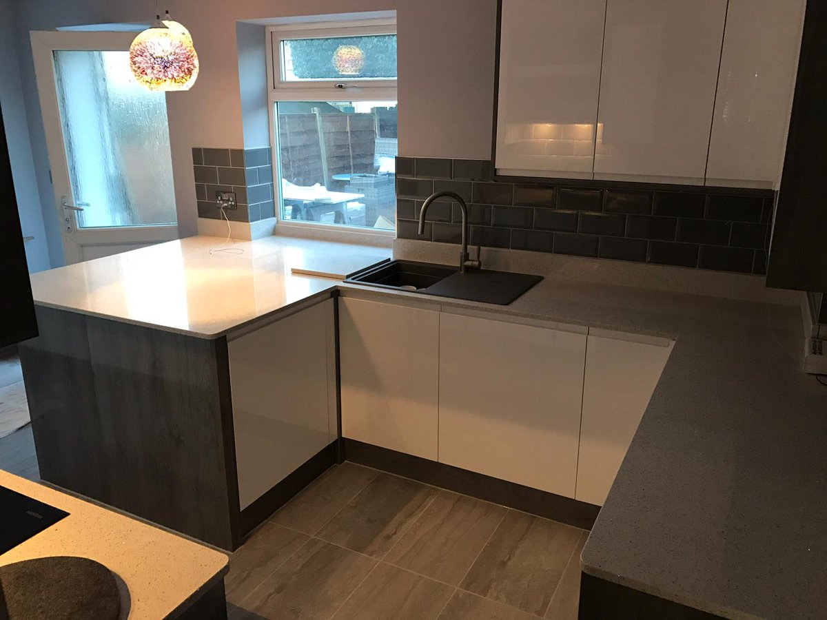 Kitchen Refit Handleless White Gloss With Grey Oak Worktops Matt