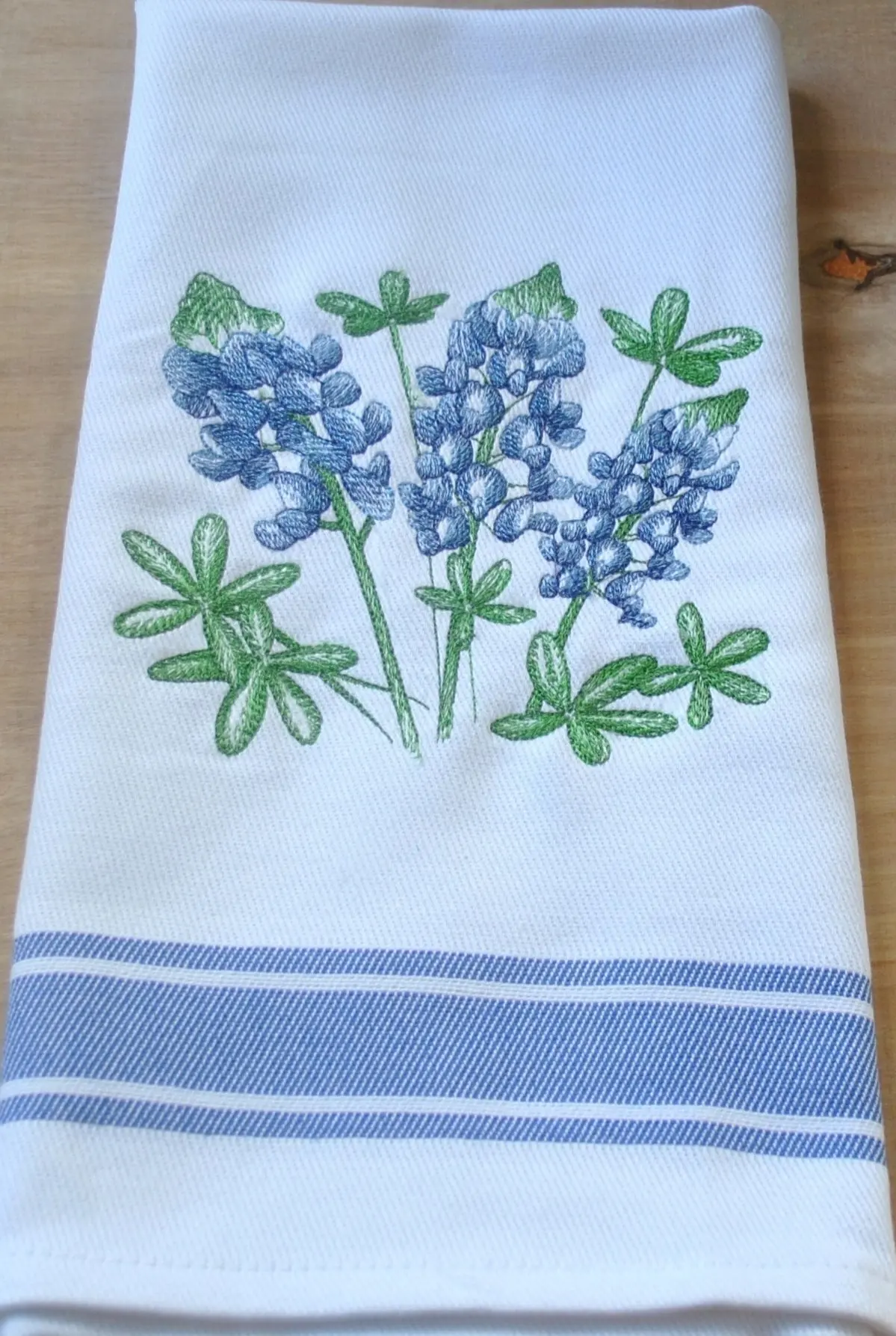 White Kitchen Towel Embroidered With Bluebonnet Border