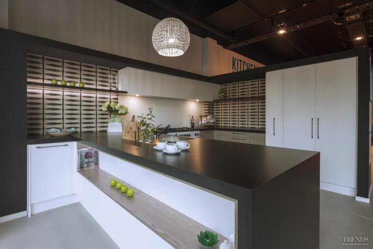Modern Black And White Kitchen With Grey Toned Wood Veneer And