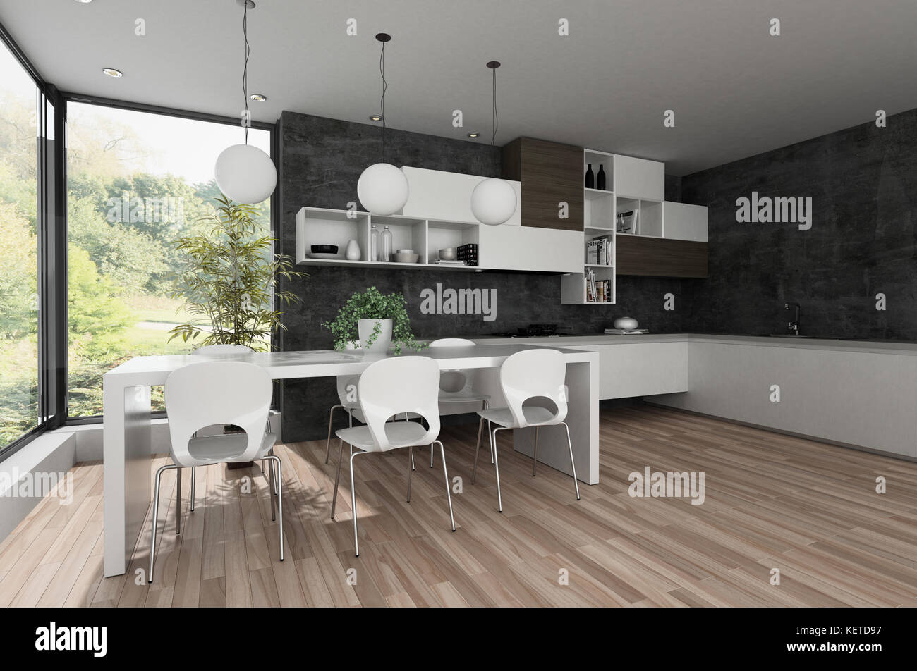 Stylish Modern Black And White Kitchen Interior With Fitted Stock