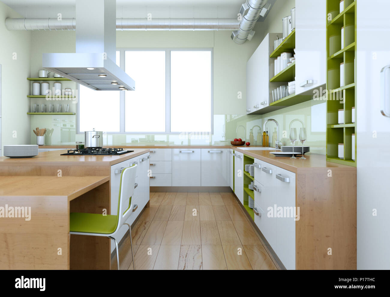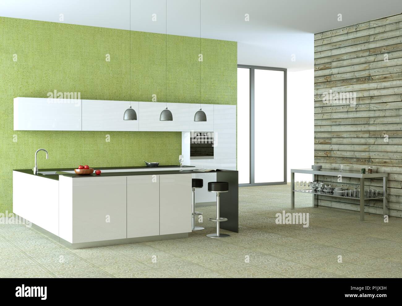 White Modern Kitchen With Green Wallpaper Stock Photo 207554693