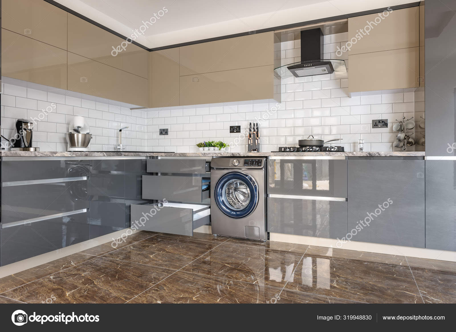 Luxury Modern White Beige And Grey Kitchen Interior Stock Photo