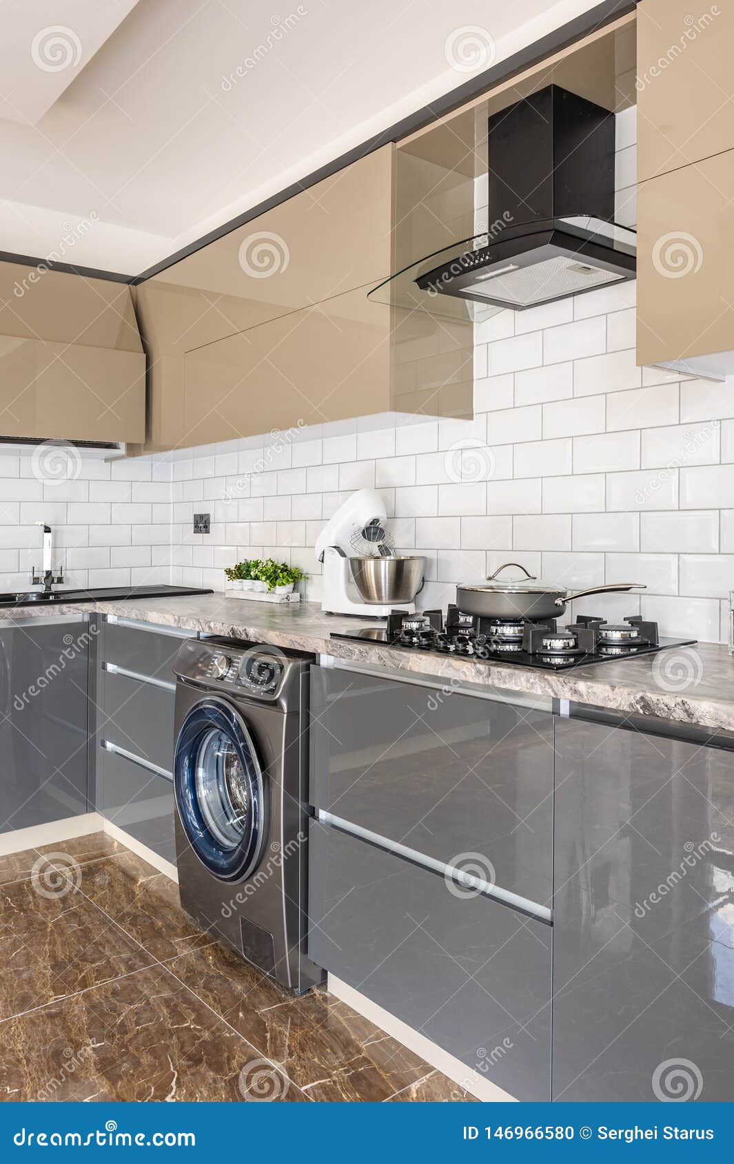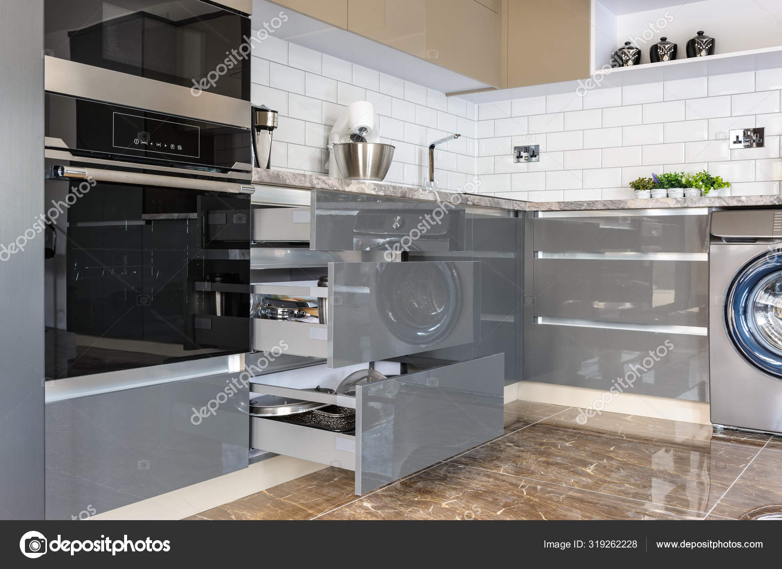 Luxury Modern White Beige And Grey Kitchen Interior Stock Photo