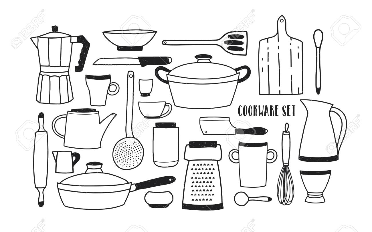 Kitchen Utensils Set Black And White Illustration Drawing