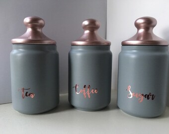 Grey And Copper Kitchen Set Of 3 Tea Coffee And Sugar Canisters