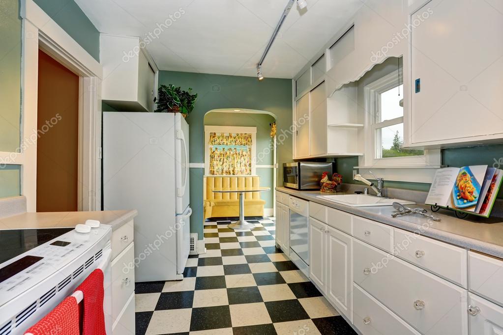 Classic Kitchen Room Interior With Blue Walls And White Cabinets